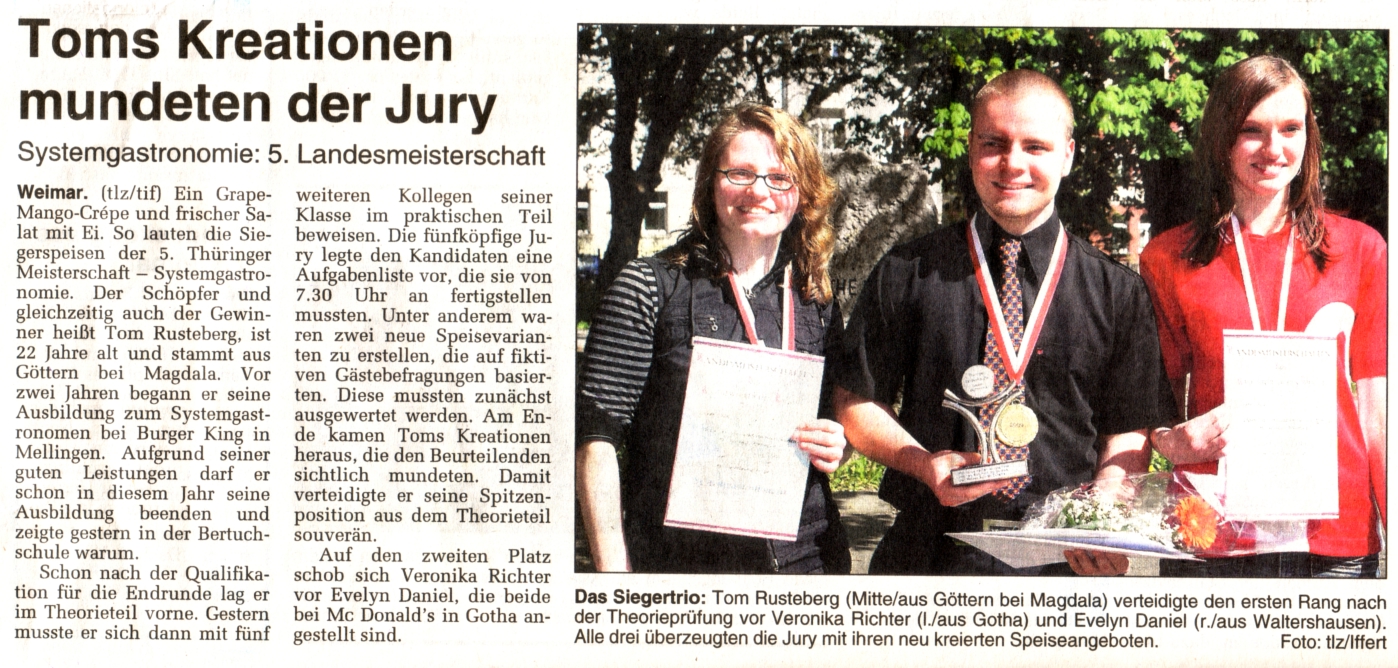Nach den Schulmeisterschaften im Gastronomiebereich folgte am 17.4.2012 die 8. Thüringer Landesmeisterschaft. Einige Bilder und Information sind hier zu finden.