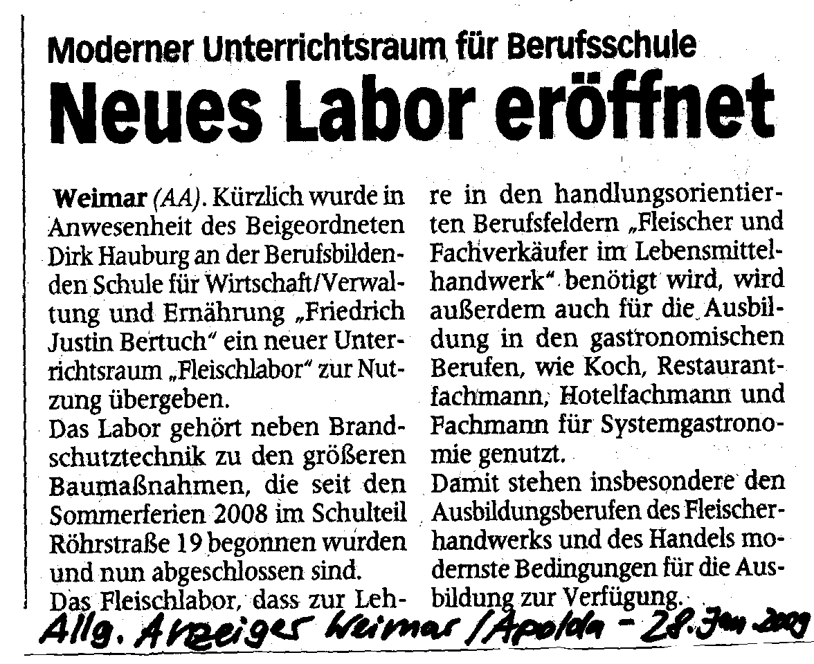 - Januar 2009 : Der Fachbereich Ernährung erhält ein Fleischlabor. Die Stadt Weimar investierte 50 000 Euro in die Anschaffung des Fachraumes. In der TLZ erschien dazu am 22. Januar 2009 ein Artikel ebenso im Allgemeinen Anzeiger für Weimar und Apolda.